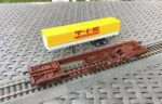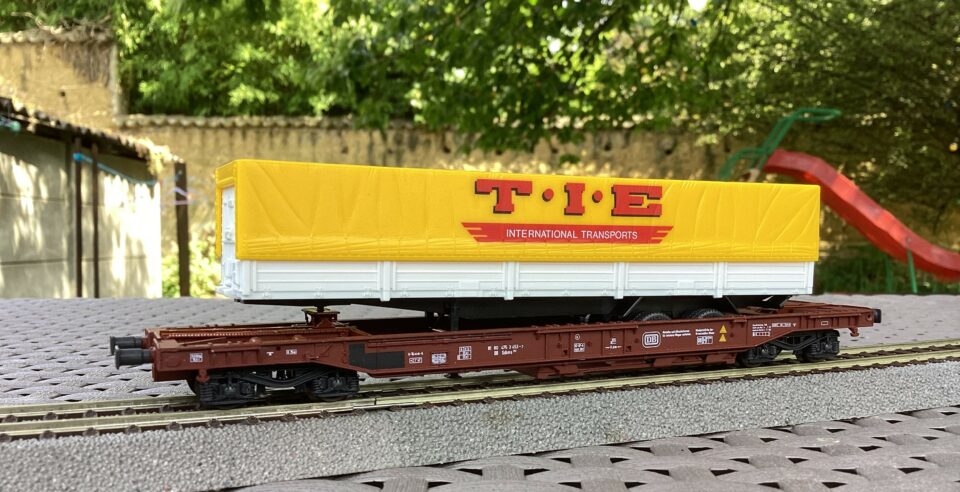 Wagon poche DB chargé d'une remorque à 2 essieux "T.I.E"