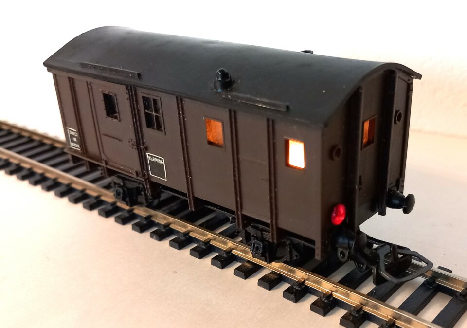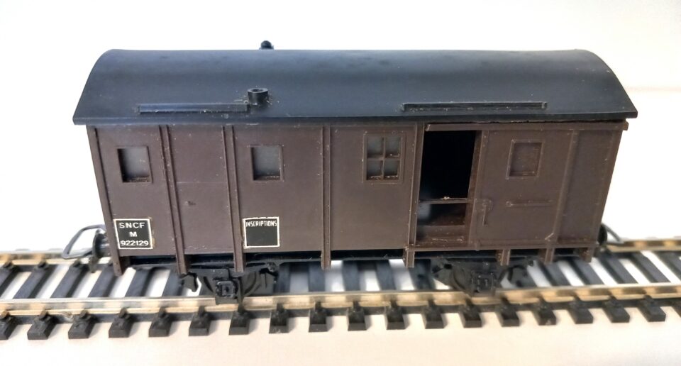 Livrée brun foncé, toit noir. Attelages à boucles. Manque un aérateur de toit.
