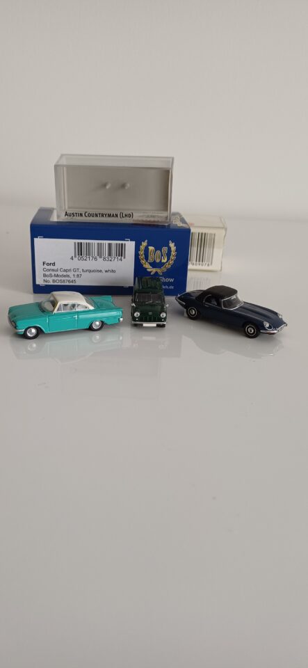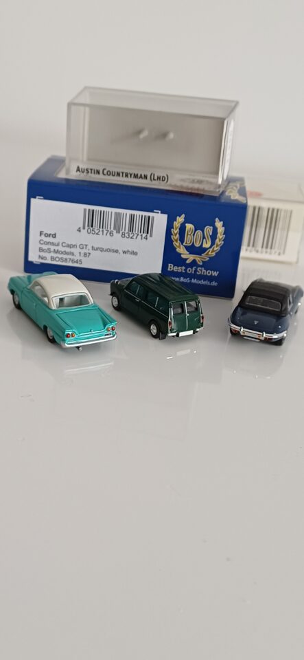 Ford Consul en résine BOS Models, Austin Countryman BREKINA et Jaguar type E RICKO. B19€