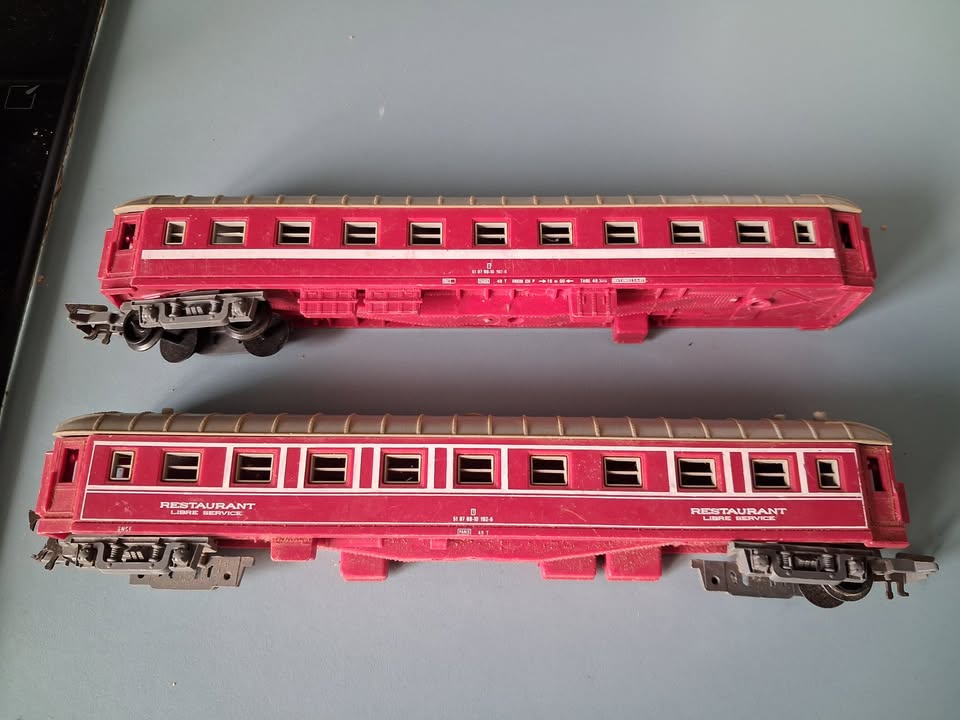 2 voitures-restaurant Jouef Champagnole SNCF libre-service, référence 868, pour pièces, en l'état, voir photos.