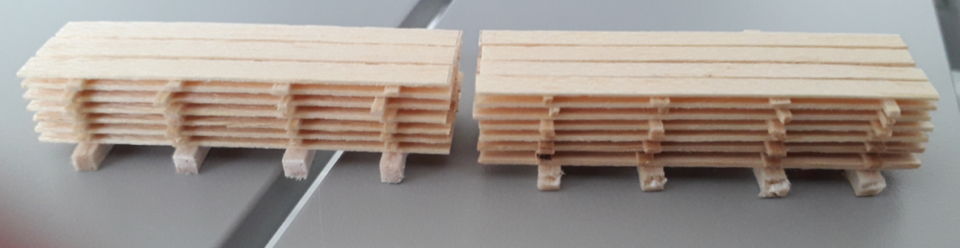 2 Accessoires pour décor ou chargement wagon plat: Planches à sécher et Troncs d'arbres débités - (Echelle H0)