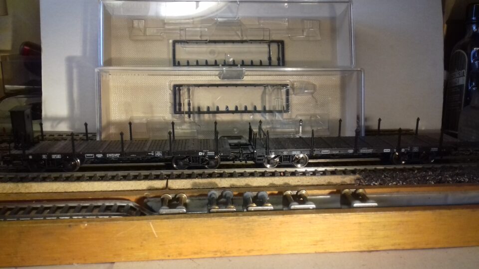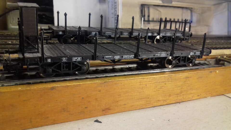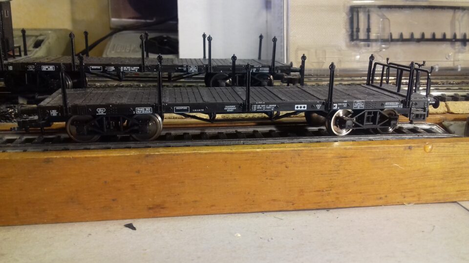 Fleischmann 2 wagons plat à bogies ref 5285 F (avec guerite) 5285F1(avec serre frein) en BO plexi et en parfait etat reglement par cheque port en sus 8€