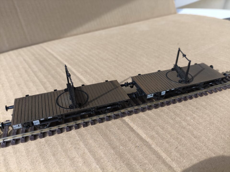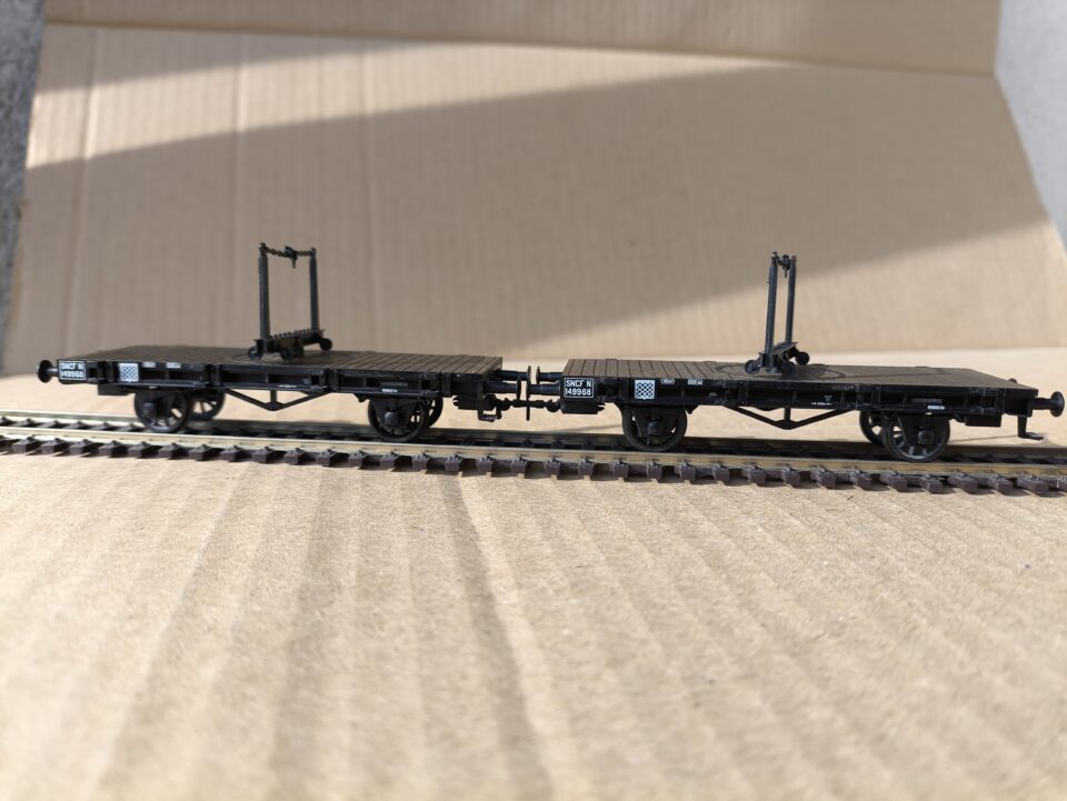 Vends un couplage de wagons plats à traverses pivotantes pour charges longues. SNCF, n° 149968, époque III.