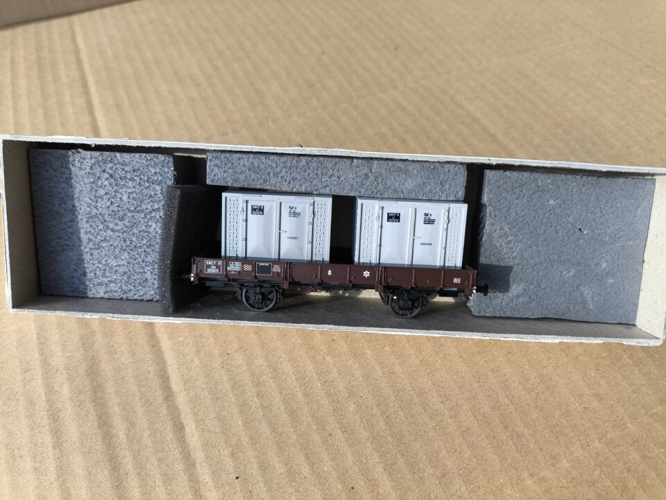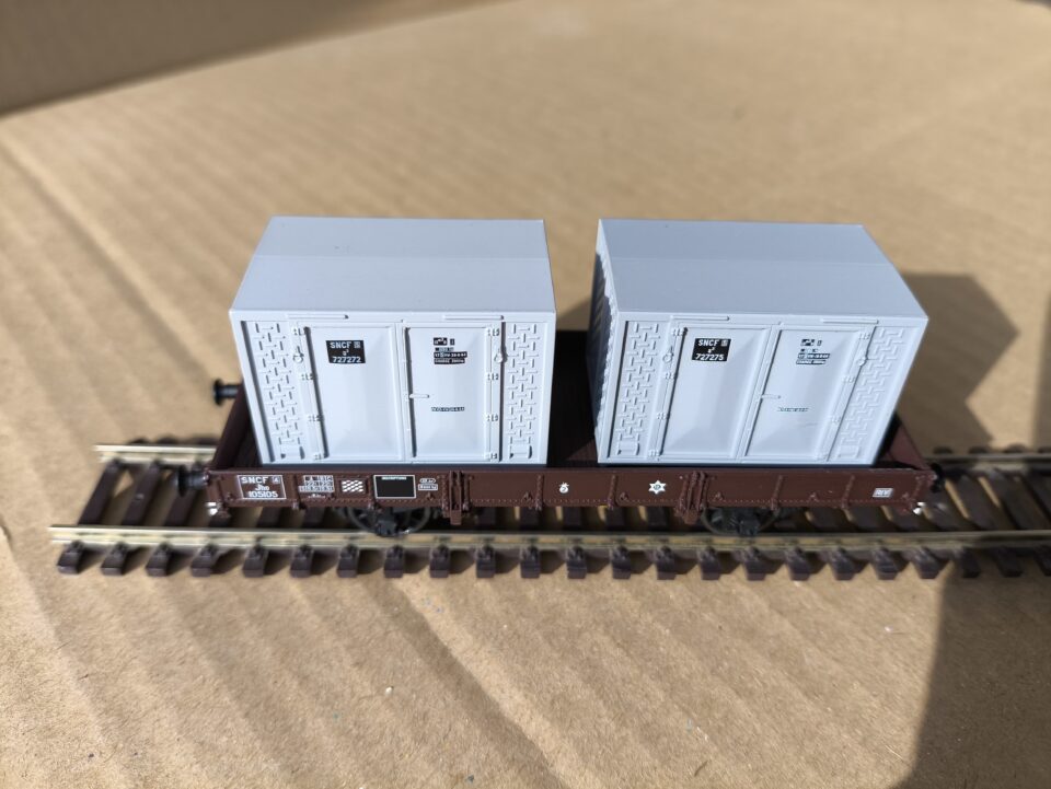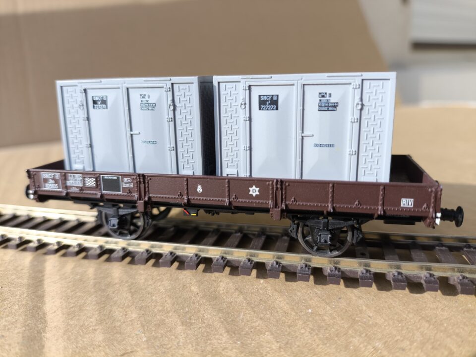 Wagon plat 2 essieux ocem 29 SNCF, n° Jho 105105, époque III. Chargé de deux containers . Marque REE modèles référence WB 062. - (HO Matériel Remorqué)