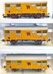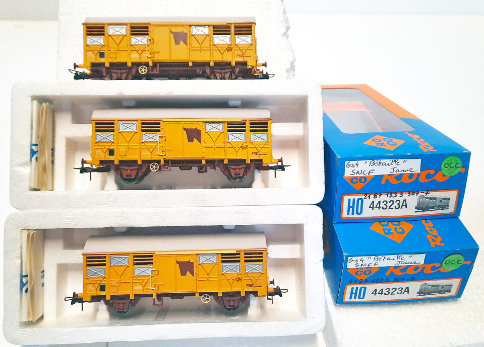 Vends, échelle HO 1/87ème, un lot indissociable de 3 wagons marchandises couverts à 2 essieux pour bovins type "Gs 41.6" Époque 4 SNCF (n° 21 87 123 3 307-7), attelage à boucle NEM avec élongation, marque ROCO, référence 44323A.