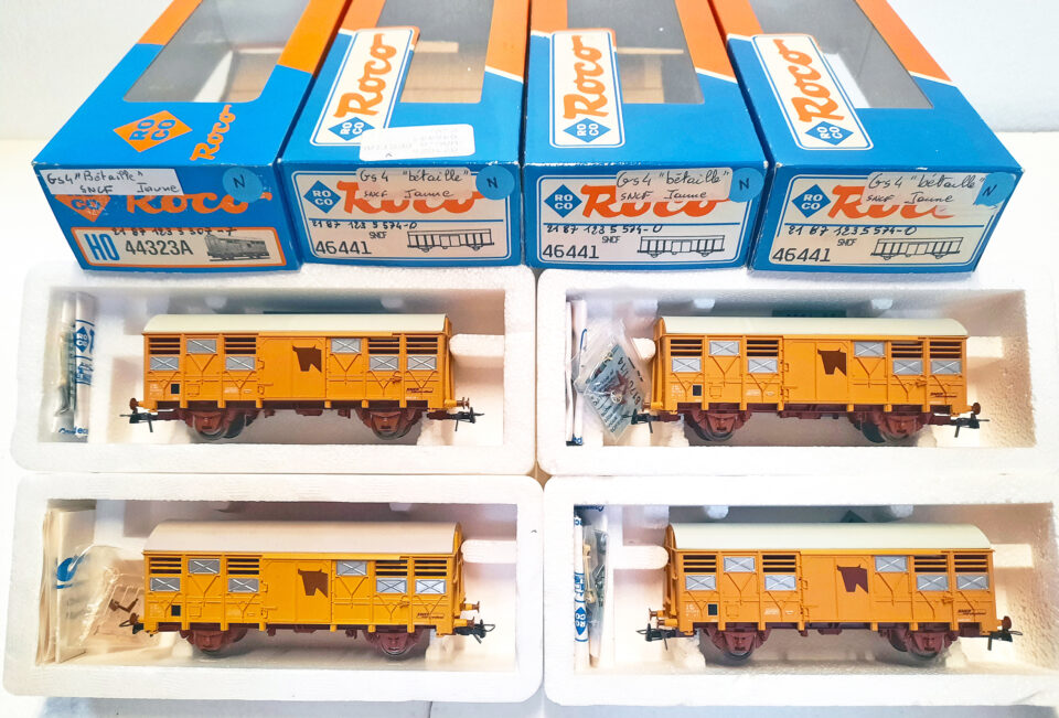 Vends, échelle HO 1/87ème, un lot indissociable de 4 wagons marchandises couverts à 2 essieux pour bovins type "Gs 41.6" Époque 4 SNCF, attelage à boucle NEM avec élongation, marque ROCO, soit les références :