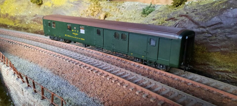 Fourgon PTT « Z » à bogies des chemins de fer suisses (CFF) – caisse verte – toit brun – attelages à boucles - époque IV – traces sur toiture – marque ROCO – 30€ + port.