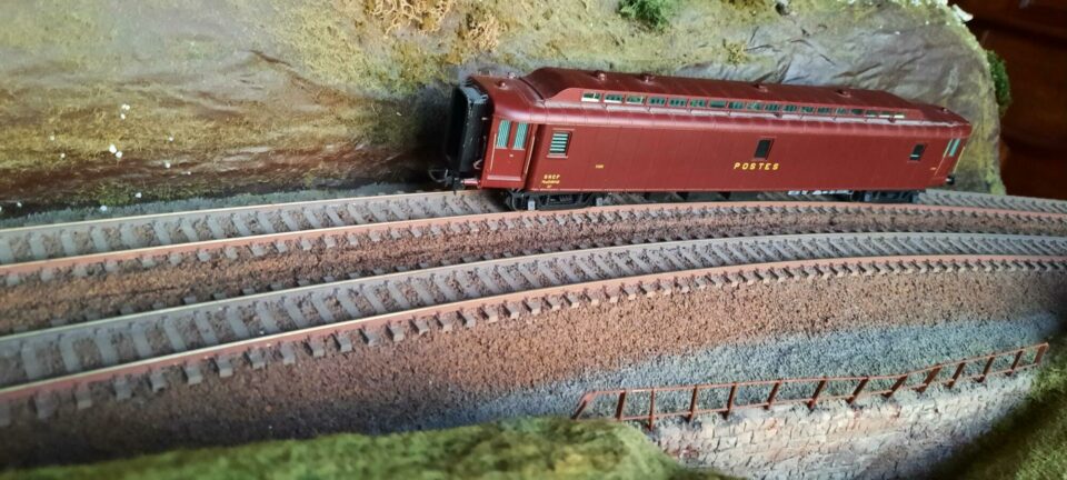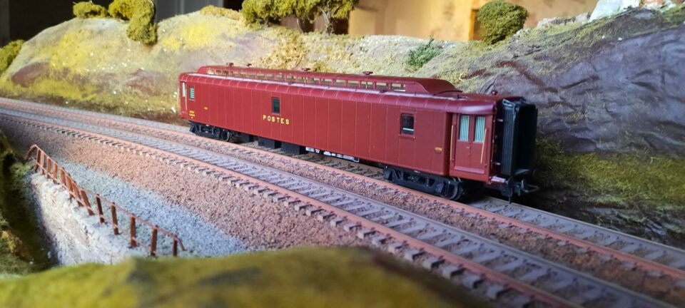 Voiture « POSTES » SNCF à bogies – type PAz (ambulant) – caisse rouge bordeaux – lanterneaux – attelages à boucles et à élongation variable – tampons à ressorts mais manque 2 tampons et 1 ligne de toiture latérale – époque III – marque REE – 30€ + port.