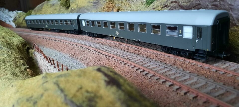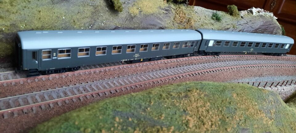 Lot de 2 voiture voyageurs des PKP (chemins de fer Polonais) de 2ème classe pour trains internationaux de type Paris-Varsovie - type B10 UIC - époque IV - couleur vert olive - aménagement intérieur à compartiments - lestées - avec sachets de détaillages - attelages à boucles et à élongation variable - marque HERIS – 100€ le lot ou 50€ pièce + port.