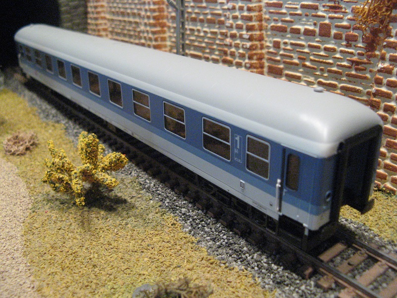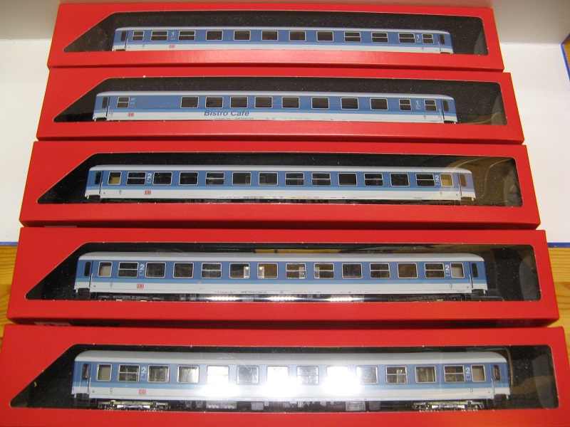 HO set 5 personenwagen DB Intérégio ROCO 1cl 45050 / Bistro café 1cl 45051 & 3 2cl 45052 2 rails en très bon état.