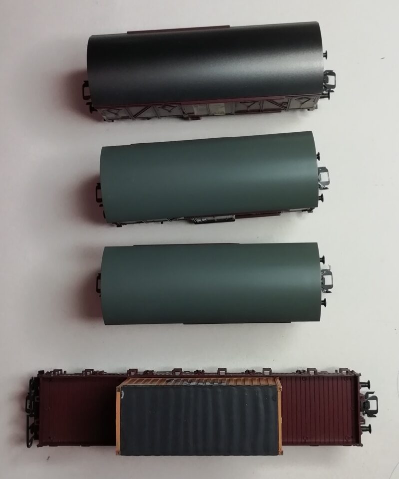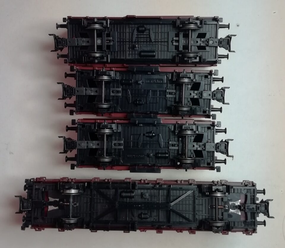 Märklin 3 wagons couverts et un plat à ridelles avec container. Attelage à élongation - (HO Matériel Remorqué)