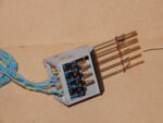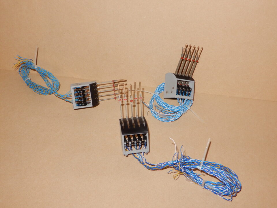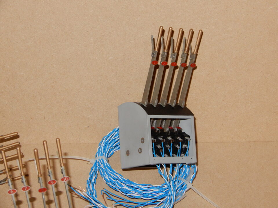 Ensemble de 3 blocs de 5 leviers à crans, pour commande d'aiguilles motorisées ou de signaux lumineux. Les leviers sont chacun équipés d"un contacteur en partie basse. Les leviers sont numérotés de 1 à 15.