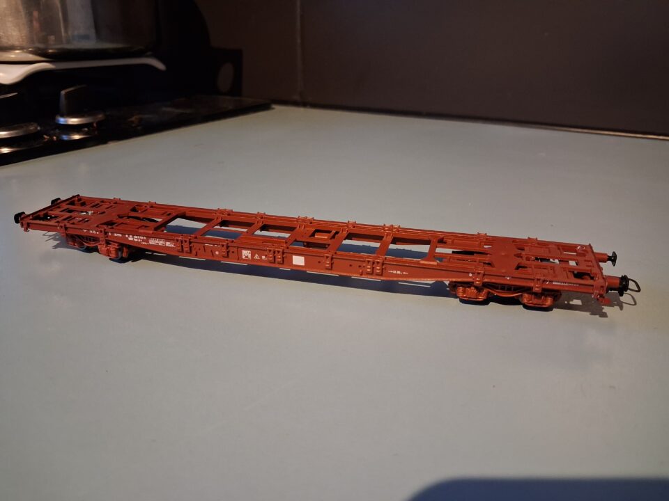 Vends ce wagon plat à bogies multifret brun Jouef SNCF type Sgss immatriculation en 81 87 454 9 757-3 (série spéciale RMC Caen) SNCF HO.