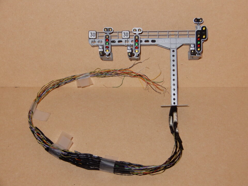 HO - Potence de signalisation avec 3 nacelles - métal - LED, y compris pour les œilletons - C18: C,S,M,A,VL + 30 + ID2 - C20: C,S,M,A,VL + 30 + ID2 - C22: C,S,M,RR,A,VL + ID2 - commun au négatif - 1 câble par LED pour le + avec 1 résistance de 1000 ohms - pas de diode - si envoi, prévoir des frais pour le port - règlement par virement - j'ai aussi des feux sur mâts, et des pylônes d'éclairage