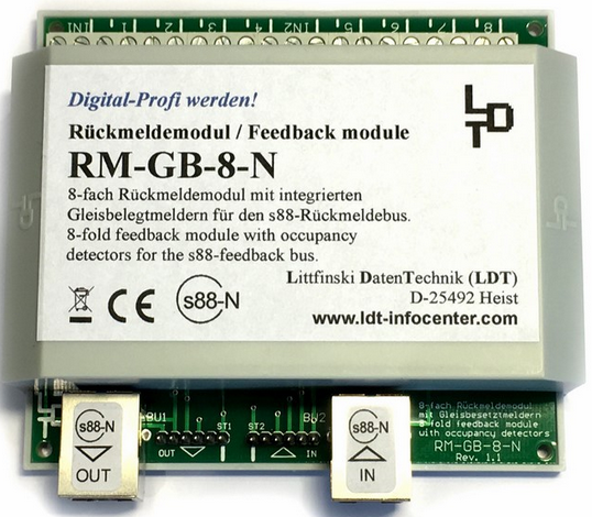 Très peu servi, 3 modules RM-GB-8-N de LDT est un module de rétro-signalisation compatible avec le bus s88-feedback, utilisé pour détecter l'occupation des voies et gérer les arrêts des locomotives dans les gares ou les cantons. Il est disponible en kit ou en module fini, avec des connexions s88-standard et s88-N.