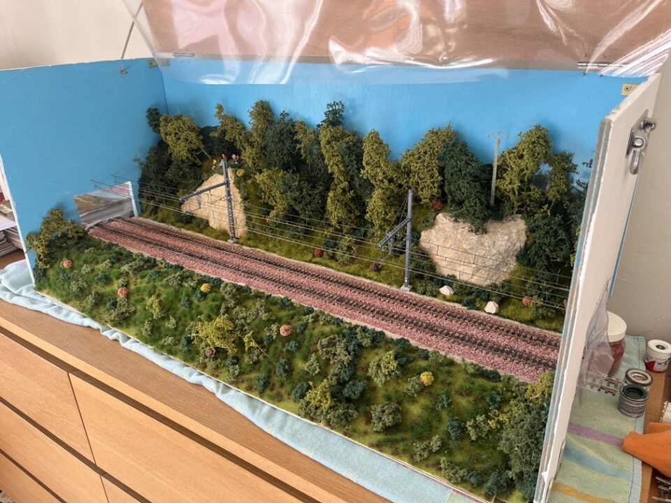 Rails Roco Geoline code 83, les pylônes caténaires proviennent de chez Micheline production (fabrication artisanale), les fils de caténaire sont de marque JV