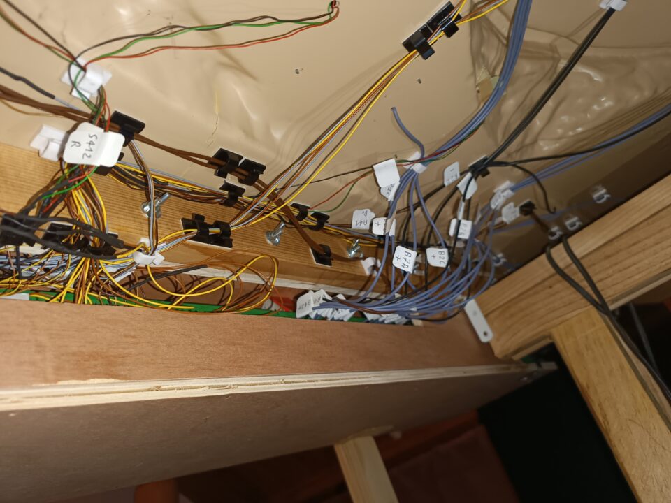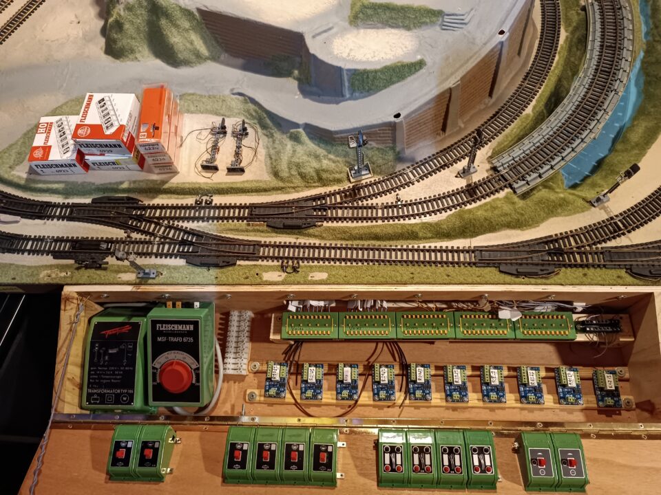 - Les 10 aiguillages sont motorisés. Il y a 5 feux fonctionnels et plusieurs sections d'arrêts. L'ensemble est précablé et connecté à un pupitre de commande (rajouté) équipé de boîtiers de commandes et borniers Fleischmann plus les relais.