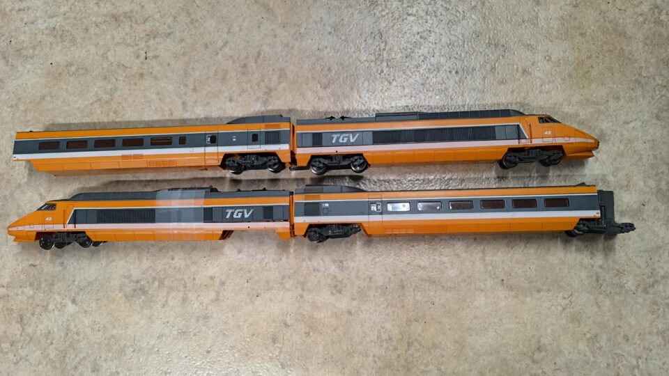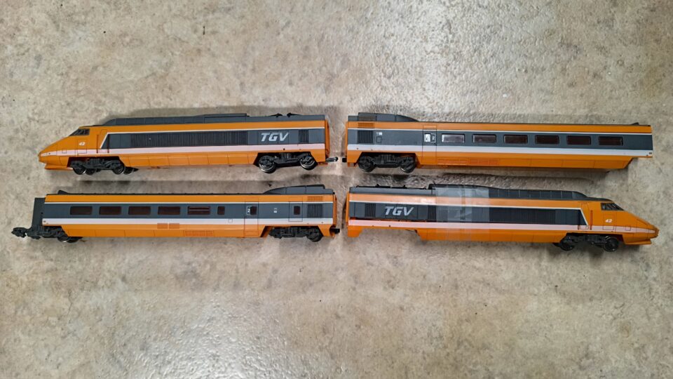 Quatre éléments d'un TGV Jouef incomplet (pas de moteur, un boggie cassé, un essieu manquant!
