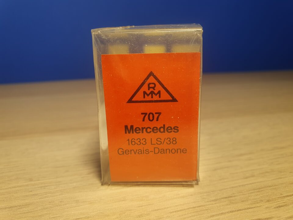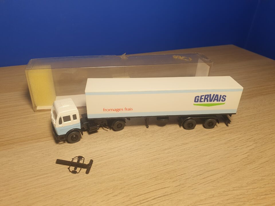 Je vends un camion Mercedes 1633 LS/38 avec semi-remorque Gervais Danone Roskopf réf. 707. Neuf, pièces de détail à monter. 12 euros plus port