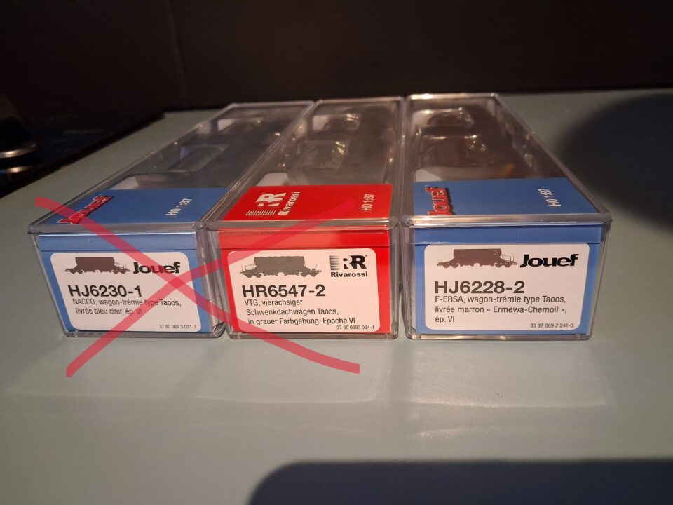 Suite à l'achat de 3 coffrets de nouveaux wagons Taoos Jouef et Rivarossi , je me sépare d'un des exemplaires de chaque coffrets :