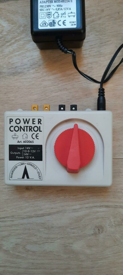 Transformateur + poste de commande pour trains miniatures - marque RIVAROSSI/LIMA/ARNOLD/JOUEF - adaptateur transformateur COMELIT modèle 481214/E - 230V/14V - 0,85A - poste de commande-régulateur avec 2 sorties : 1 sortie traction 0-12V continu - 1 sortie accessoires 14V alternatif - très bon état - 30€.