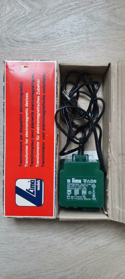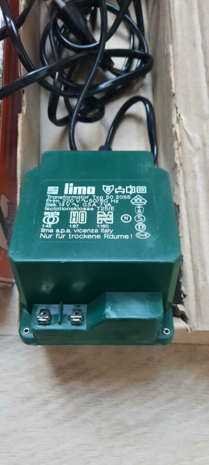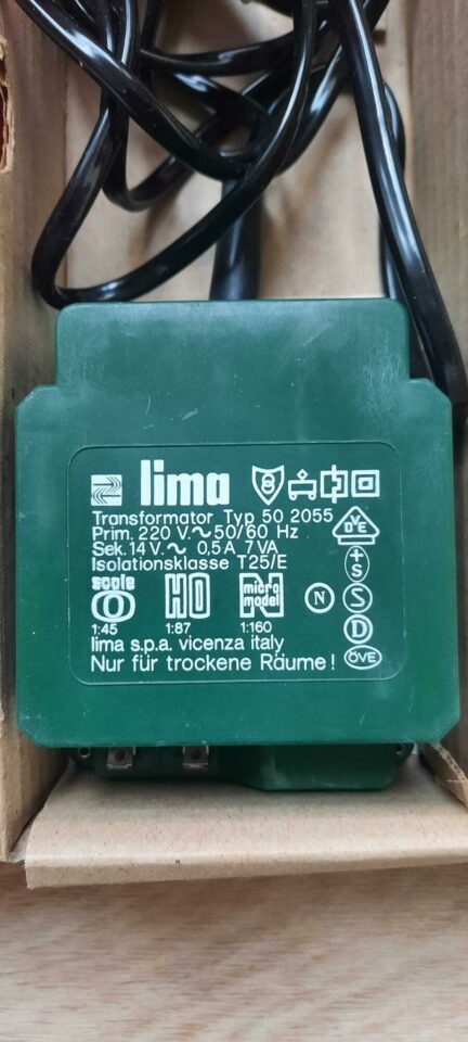Transformateur LIMA 50 2055 – 220V/14V CA – 0,5A – 2 bornes de sortie pour accessoires électromagnétiques HO – pas de sortie traction – très bon état – 12€.