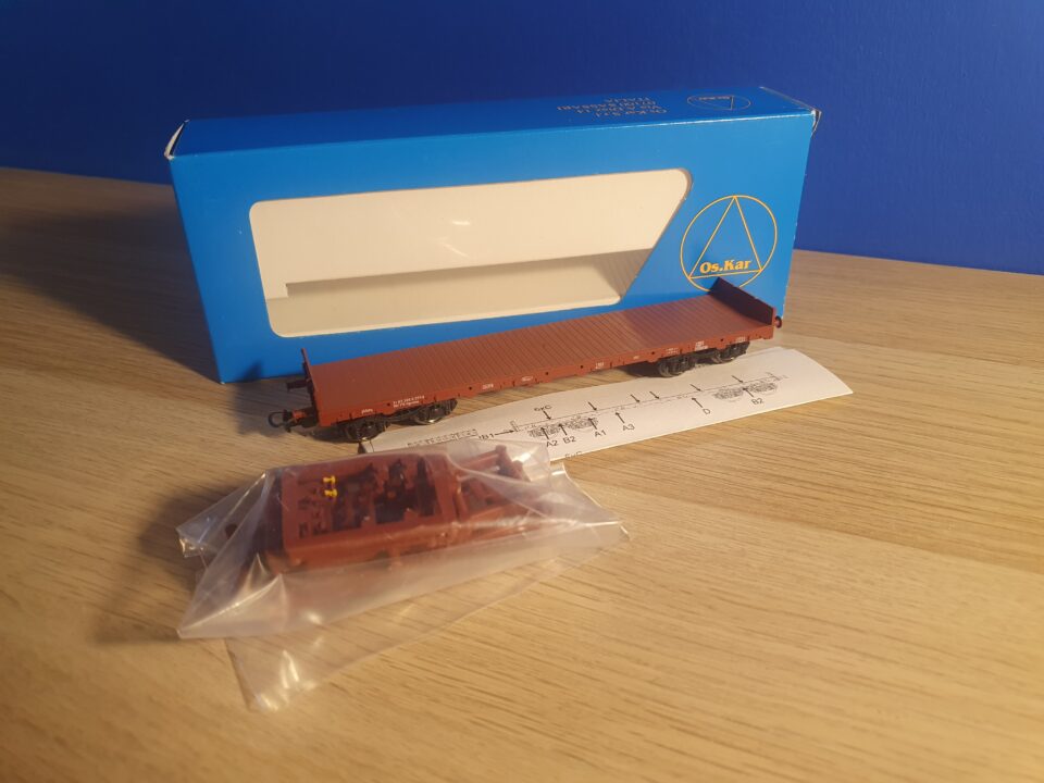 Je vends un wagon plat FS Os.Kar réf. 4006. Neuf, pièces de détail à monter. 30 euros plus port