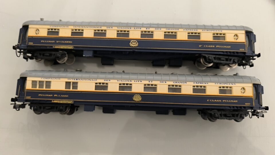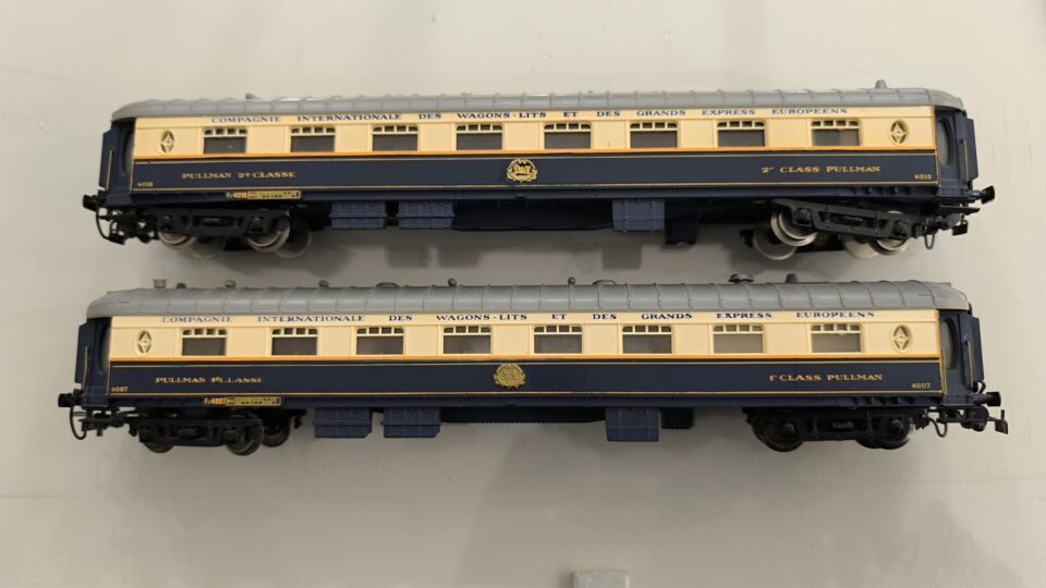 En parfait état, un couplage Pullman "Flèche d'Or", 4007 et 4018 du RMA