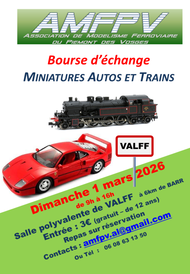 L’AMFPV (association de modélisme ferroviaire du Piémont des Vosges) organise la 50ème édition de sa bourse à la salle polyvalente de VALFF le 1er Mars prochain.