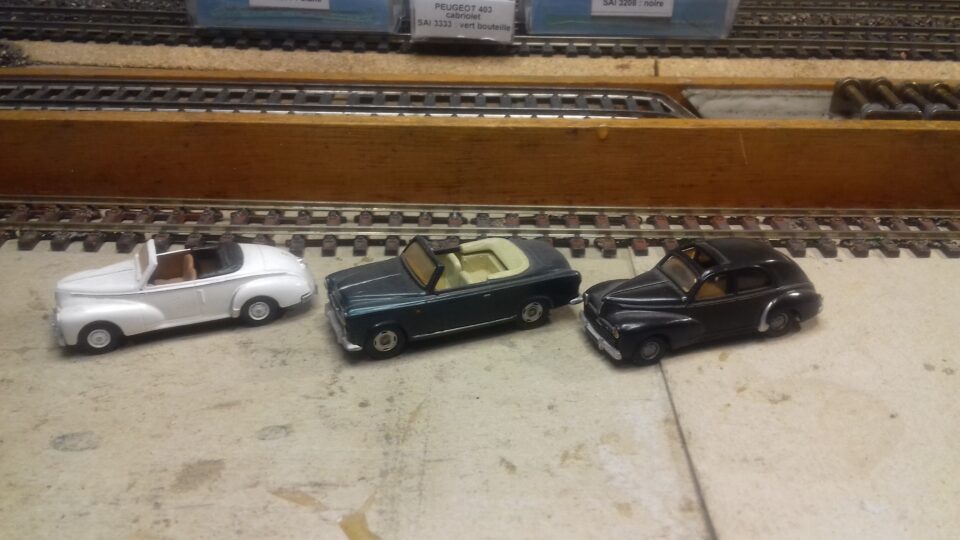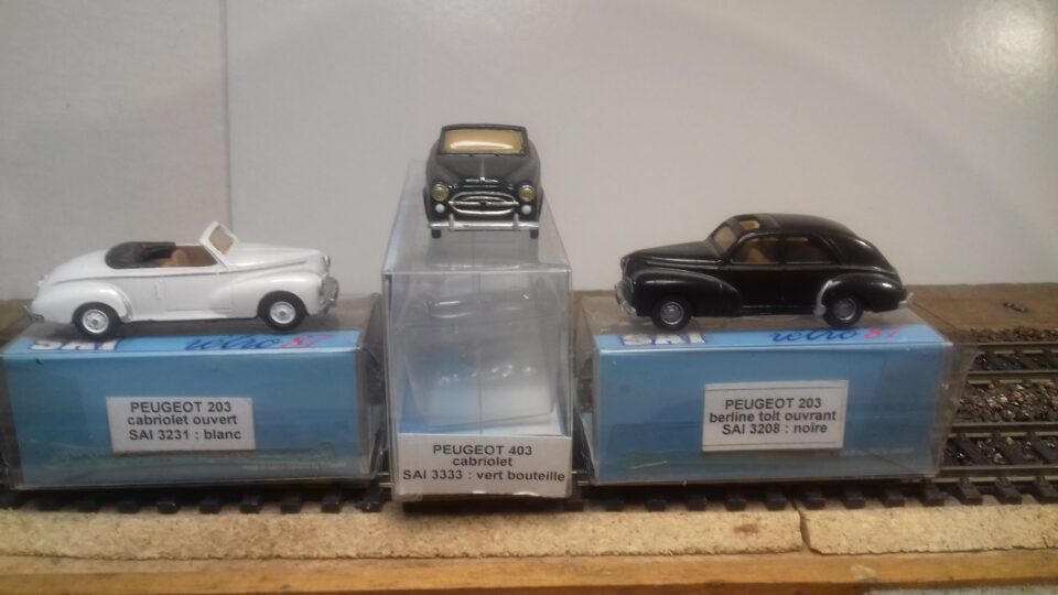SAI Ho ref 3221 Peugeot 203 cabriolet 3208 Peugeot 203 berline toit ouvrant 3332 Peugeot 403 cabriolet toutes en BO avec accessoires (essuies glaces) à poser en parfait etat reglement par cheque port en sus 6 €