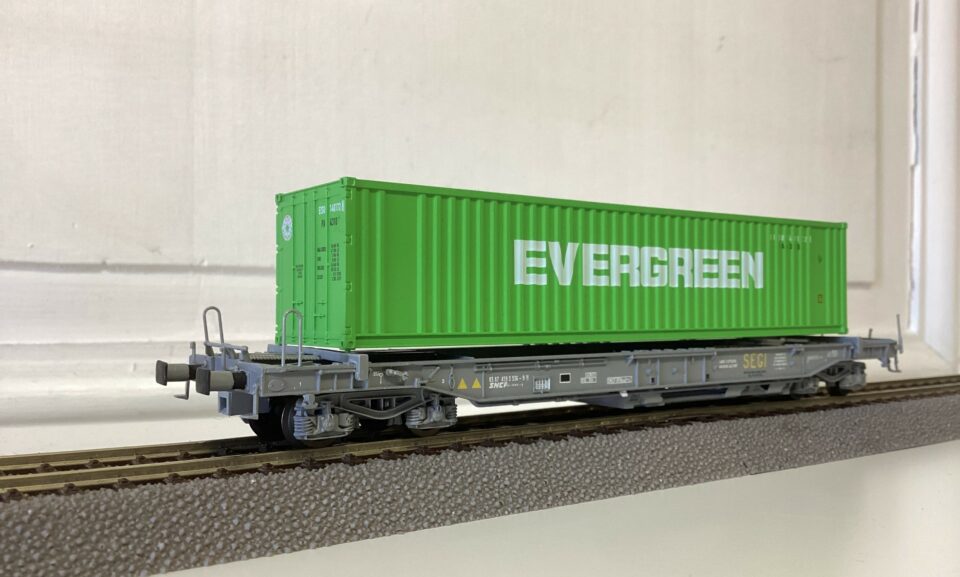 Wagon poche "SEGI" chargé d'un conteneur 40 pieds "EVERGREEN"