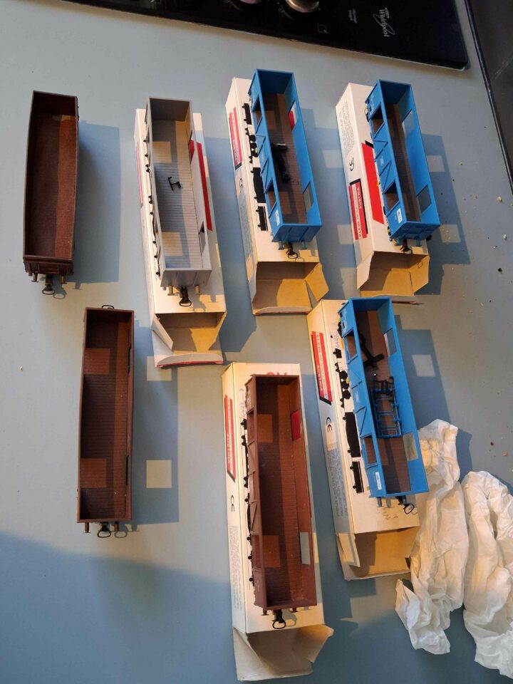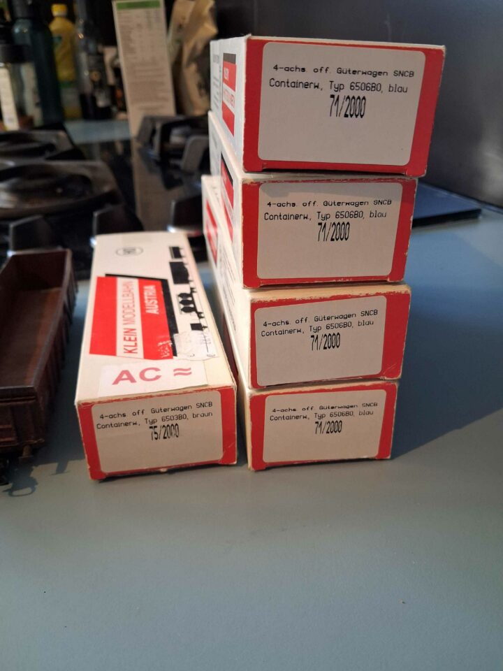 Je vends un lot de 7 wagons tombereau type Eaos SNCB 6 pour transport de containers IFB et 1 transport de verre cassé de marque Klein Modellbahn.