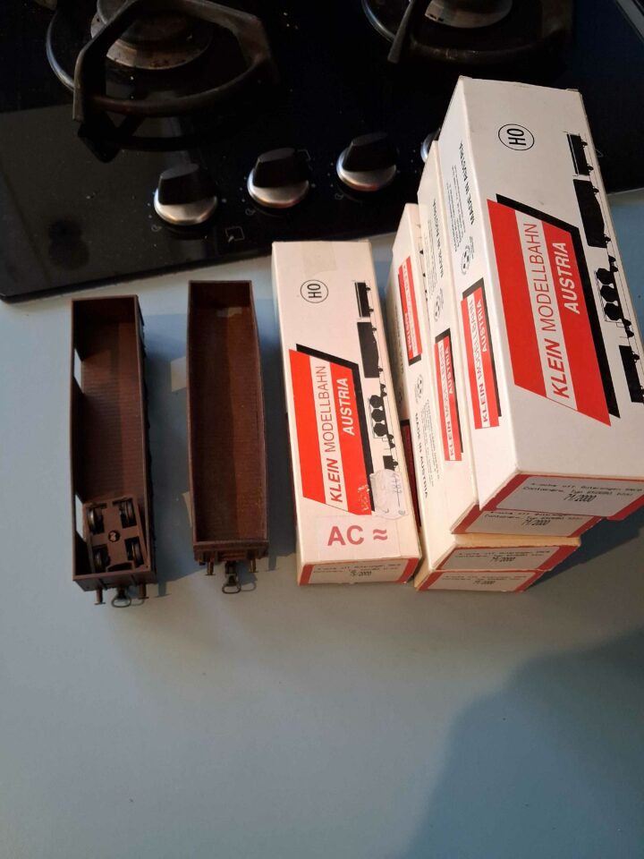 Je vends un lot de 7 wagons tombereau type Eaos SNCB 6 pour transport de containers IFB et 1 transport de verre cassé de marque Klein Modellbahn.