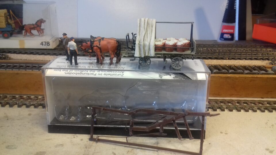 Preiser Ho charette avec paniers tirée par 2 chevaux et 2personnages brides d'attelage en sup.en BO ref 30449 en tbe reglement par cheque port en sus 5,5€
