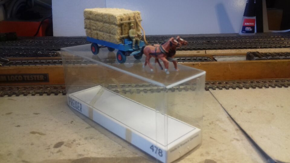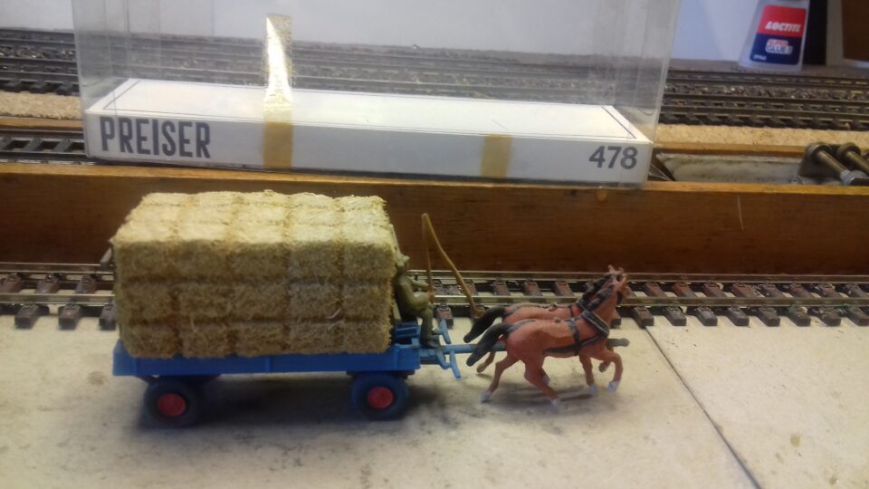 Preiser 2 chevaux tirant une charette de foin ref478 en BO TBE reglement par cheque port en sus 5,5€