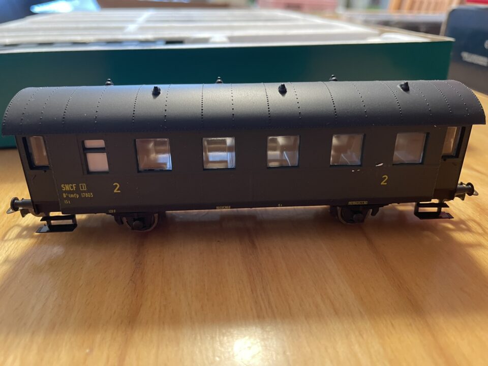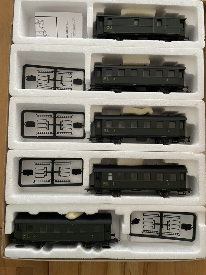 Vends Sachsenmodelle 14024+14394 rame de 5 voitures, 4 voitures 2ème classe et fourgon surnommées "boîte à tonerre" neuves. Attelage à élongation et numérotation différente pour chaque voiture. Pièces de détail à monter. Prévoir frais de port 9 € en plus.