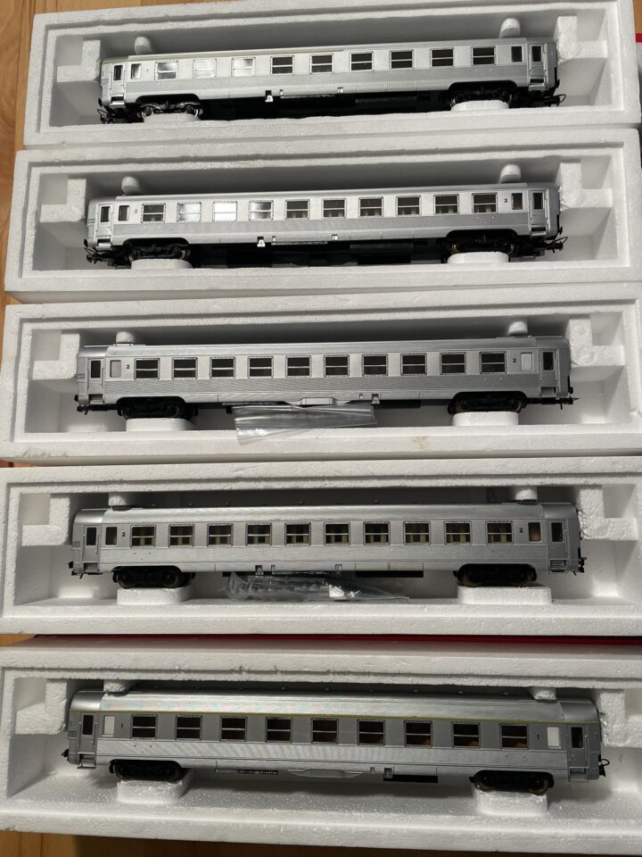 Vends Rivarossi lot de 5 voitures Sud-Est époque 3, 1 1ère classe (3543), 1 mixte(3656) et 3 2ème classe (3546 et 2x3654). Attelages NEM à élongation. Prévoir frais de port 9 € en plus.
