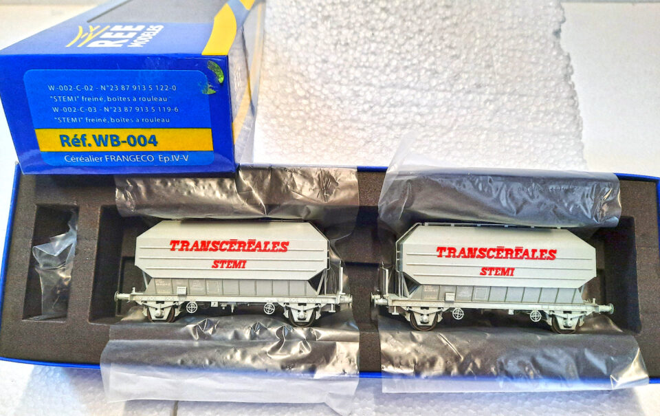 Vends, échelle HO 1/87ème, un set de 2 wagons marchandises céréaliers à 2 essieux type "FRANGECO" à faces planes, en décoration "TRANSCEREALES STEMI" époque 4/5 SNCF, attelages à boucle NEM à élongation, de marque REE, référence WB-004 / WB004.