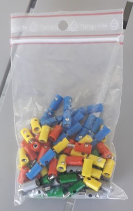 Vends 100 fiches bananes 5 couleurs (50 mâles et 50 femelles), absolument neuves jamais utilisées, 0,80€ le couple ou 35,00€ les 100 fiches par chèque ou virement, pas de Paypal, prévoir 5,50€ pour frais de port en colissimo sans signature.