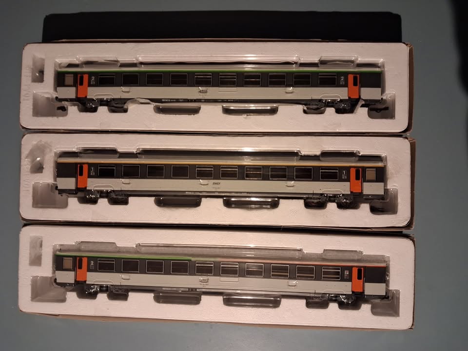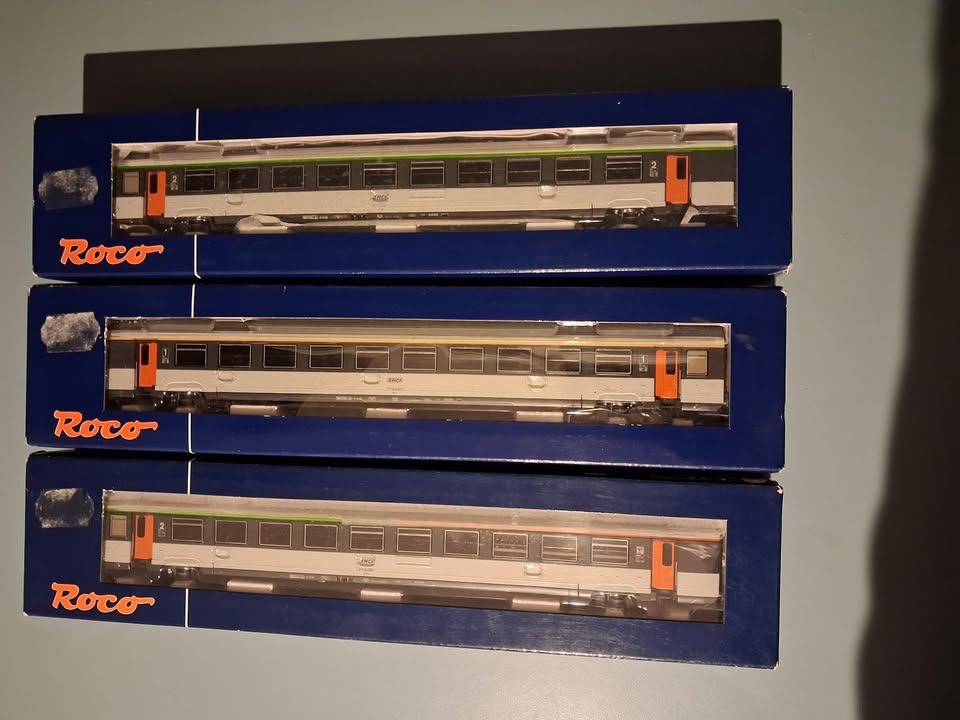 Vends ces 3 voitures Corail VTU Roco références 45734, 45735, 47736, avec jupes amovibles, logo encadré, SNCF, comme neuves, avec sachets de détaillage scellés, scotch d'origine en partie.