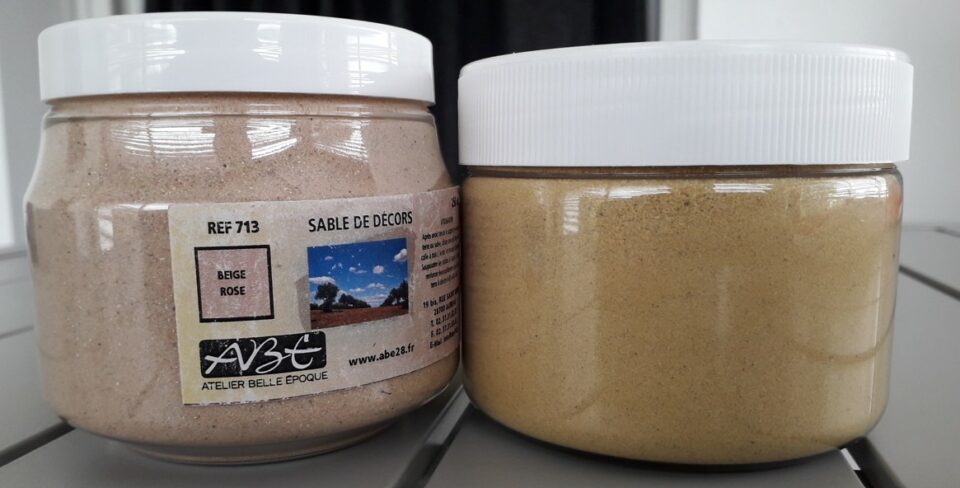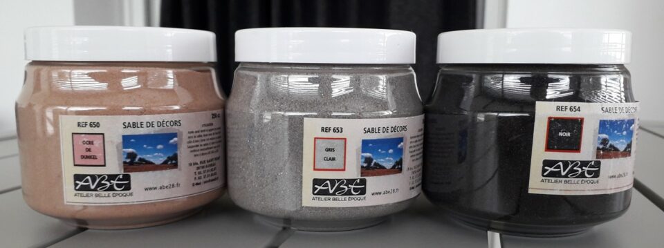Vends 5 pots de 250cc de sable à décor ABE et POLAK: ocre de dunkel (650), gris clair (653), noir (654), beige rose (713) et un pot jaune sable POLAK, absolument neufs non utilisés dans leur pot d'origine pour un montant de 13,00€ le pot ou 50,00€ les 5, paiement par chèque ou virement, pas de paypal, frais de port à déterminer suivant commande.