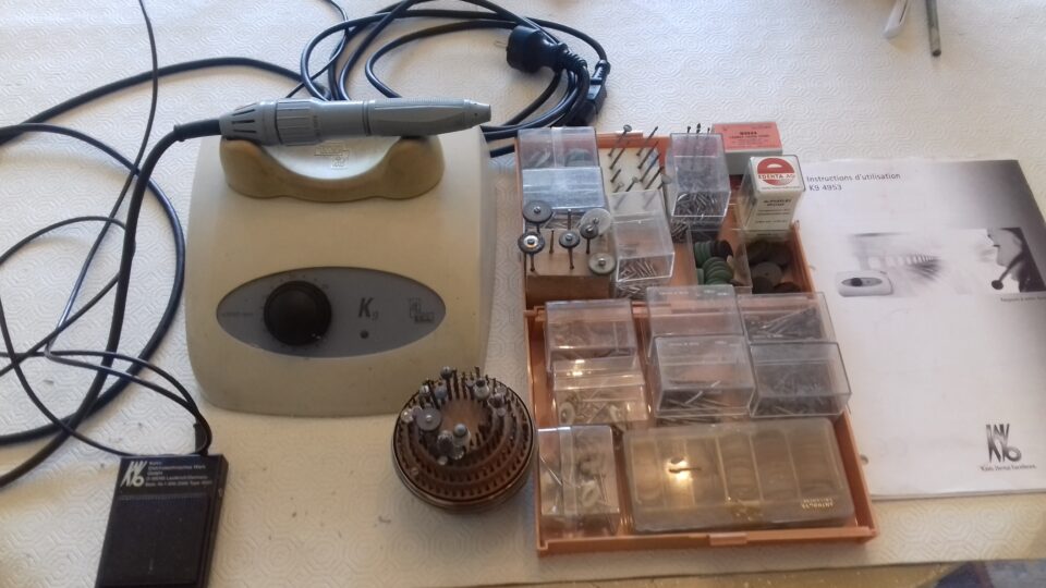 pour modelistes KAVO tour de labo de prothese ref K9 4933 avec piece à main et de nombreuses fraises(acier et diamentées) meulettes de differents materiaux disques carbo et papier presentoir fraises et notice explicative reglement par cheque port en sus 17€