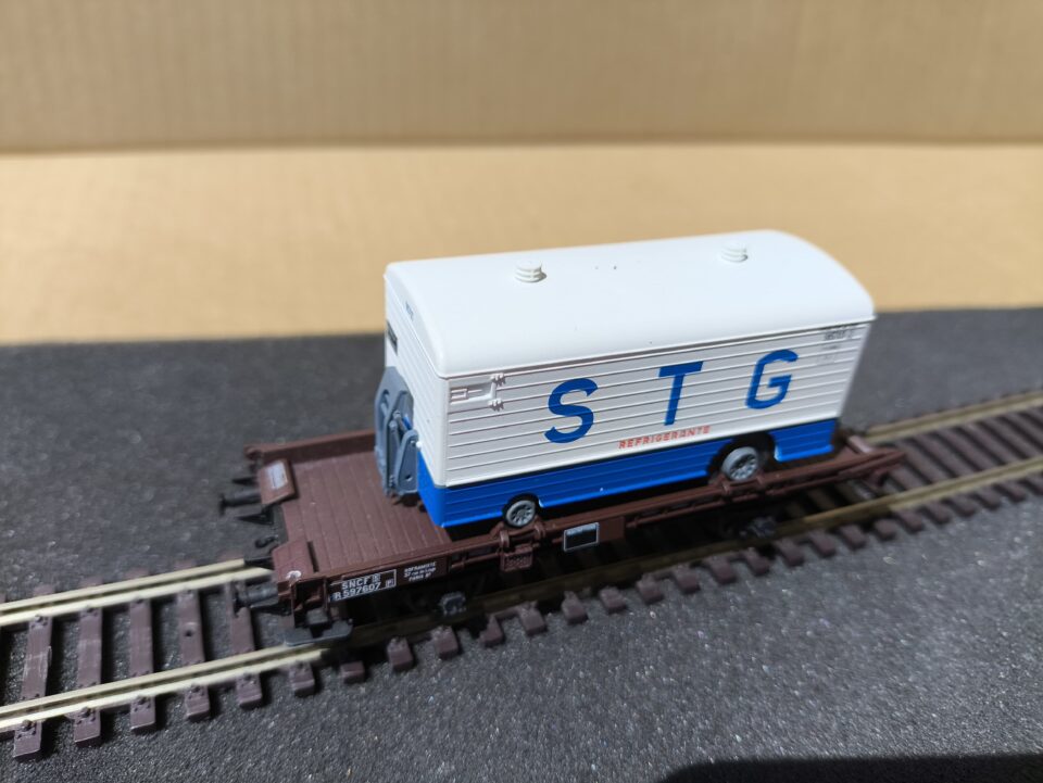 Vends un wagon plat UFR chargé d'une remorque STG. Epoque III, n°597607.