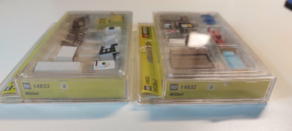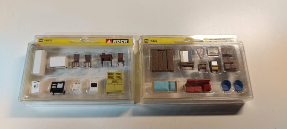 Vends deux boites de décors mobilier et électroménager à l'échelle HO.