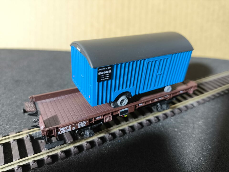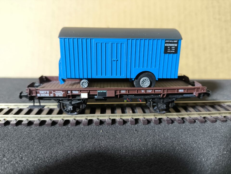 Wagon mono-porteur UFR, chargé d'une remorque fourgon, n° 587019 Marque REE modèles, référence WB 053 . - (HO Matériel Remorqué)