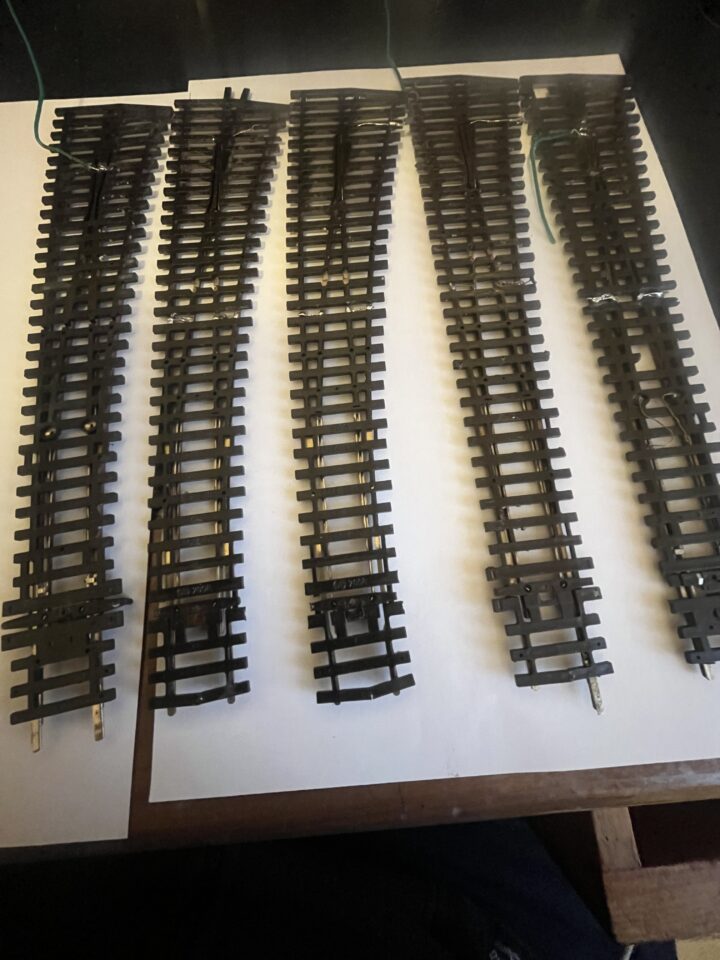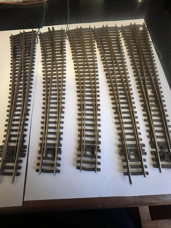 A vendre 5 aiguillages peco code 100 electrofrog patinés et préparés pour moteur lent sous table ( Type Tortoise) ressort enlevé: 2 SLE 88 ( Droit gauche) - 3 SLE 87 ( Courbe gauche)- Bon état- 60 € l'ensemble ou 12 € l'unité. proviennet du démontage de réseau.