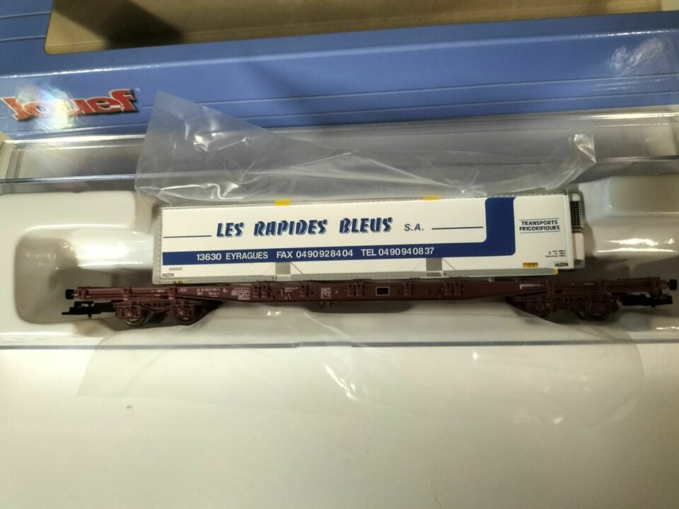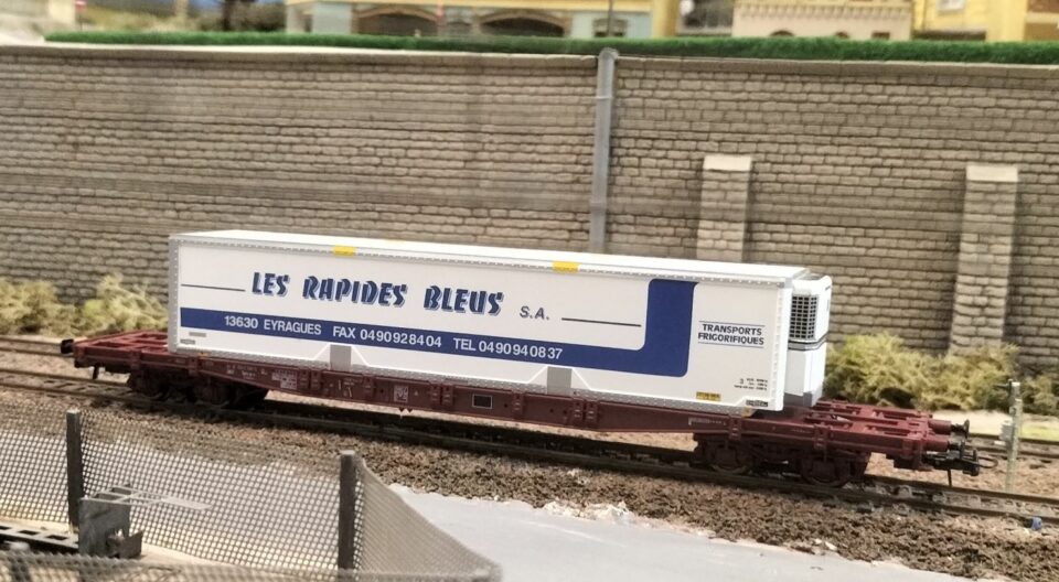 Wg Porte conteneur SG SS 63 avec caisse Rapides Bleus - (HO Matériel Remorqué)