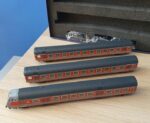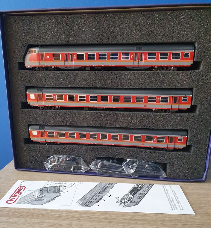 Je vends un coffret de trois voitures FS en livrée d'origine Vitrains réf. 1049. Le coffret est composé d’une voiture pilote type MDVC de 2éme classe et deux voitures type MDVE de 2éme classe, neuves, pièces de détail à monter. 190 euros plus port
