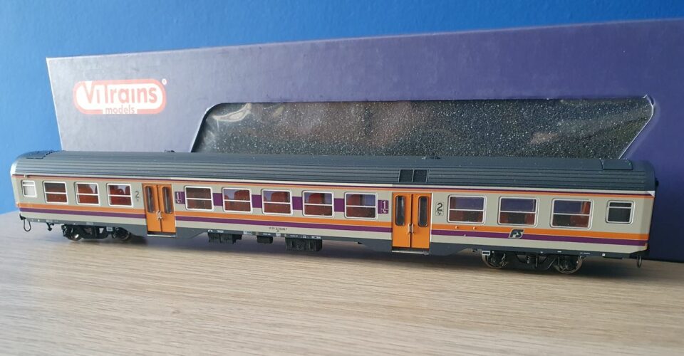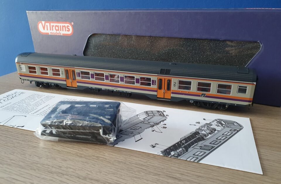Je vends une voiture FS type MDVC de 1ére/2ème classe avec éclairage intérieur de Vitrains réf. 3058. Neuve, pièces de détail montées. 70 euros plus port