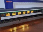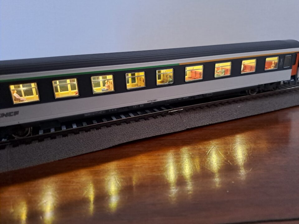 Parfait état , très peu roulé ; éclairage compartiments voyageurs avec quelques personnages à bord .Feux arrière sur fourgon .